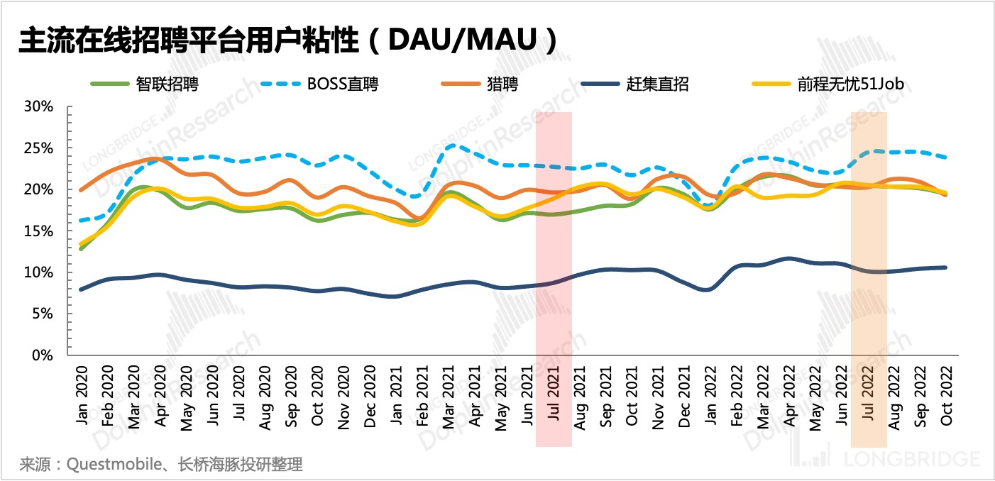 在暂停注册的这一年,智联招聘、51Job 等同行疯狂揽客,BOSS 直聘只能望流量而兴叹。但尽管面临封印,BOSS 直聘还是靠自身的产品优势和砸钱营销(二、三季度营销费用虽然同比下降,但仍然高于四季度水平)勉强维持了存量用户的 “忠诚”,同时激活部分长时间沉默的老用户,整体 MAU 未有明显流失,用户粘性 DAU/MAU 与单用户的月均用户时长都保持行业领先。