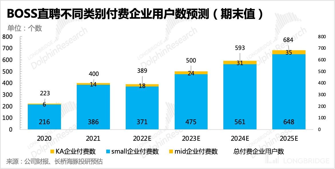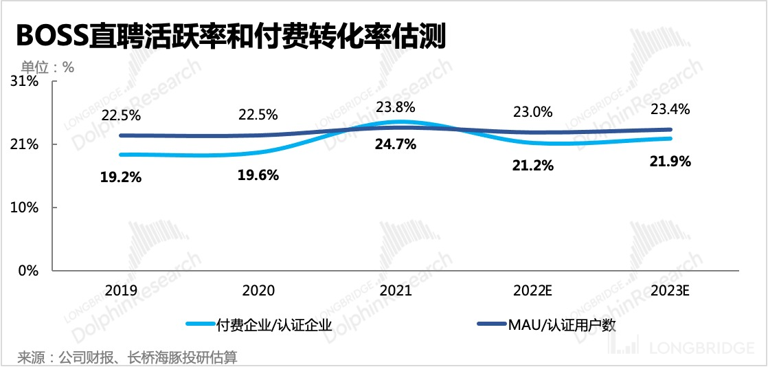 如果按照当前存量的注册用户中企业用户与求职用户的比例 1:6(2021 年数据),以及按照稳态下近 25% 的活跃率(2021 年数据)、近 20% 左右的付费转化率(2019~2021 平均水平),即: