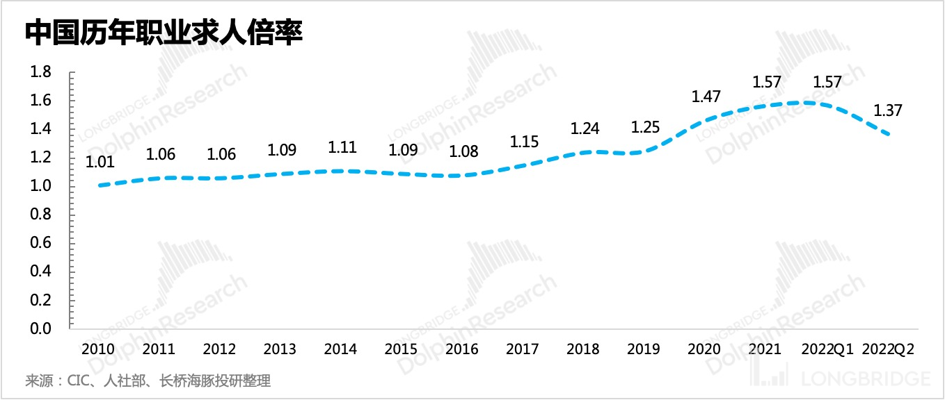 然后进入 2021 年,如果说求人倍率增速下滑是正常的回落,那么迈向 2022 年,二季度数据的陡降,则已经能够显示出背后的劳动力市场有了很大变化。