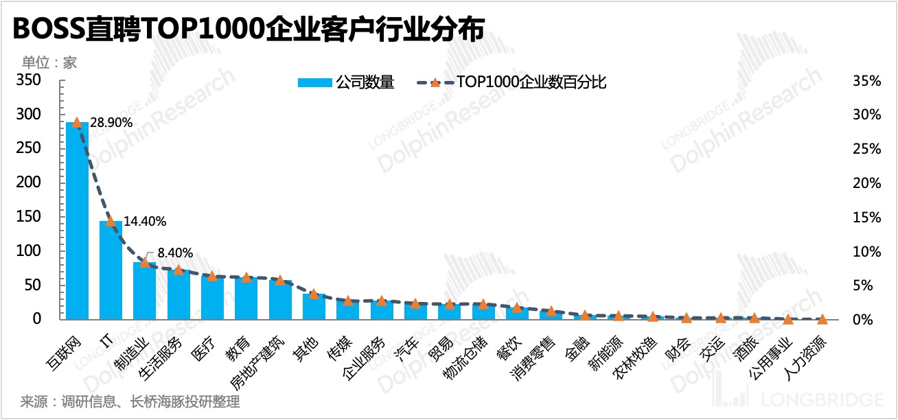 1)互联网企业客户是占比最高的类别,也最容易接受 BOSS 直聘的模式。但同时在这一波互联网裁员潮,BOSS 直聘也受到更多的连累。
