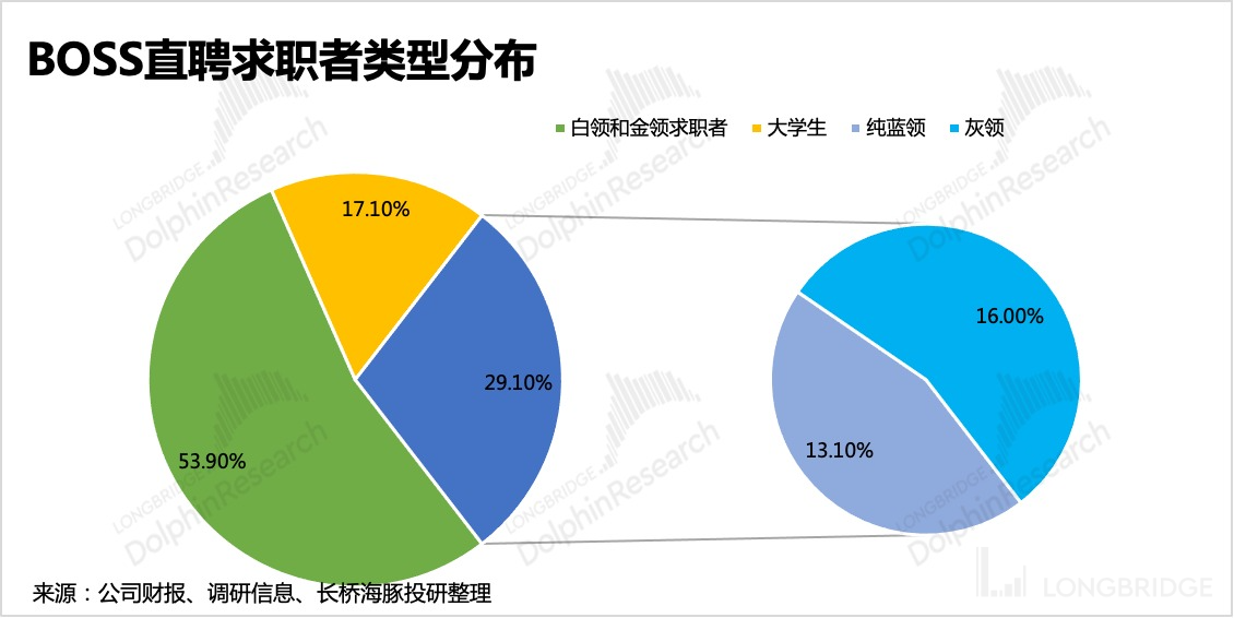 在 BOSS 直聘的招股计划书中,引用了 CIC 的市场预测:2020 年蓝领在线招聘市场 228 亿,未来 5 年 CAGR 达到 40% 以上。因此去年公司实行 “海螺计划”,从蓝领用户工作安全性、保真度的需求出发,推出工厂直招的岗位招聘功能,来扩大渗透蓝领招聘市场。根据调研信息,截至当前纯蓝领用户也是 BOSS 直聘求职者用户画像中的重要群体之一,用户占比接近 15%。
