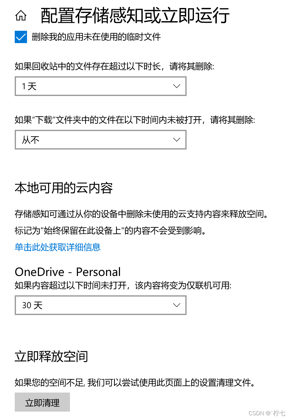 点击配置存储感知或立即运行,这里是可以设置清理周期的,而且可以进行立即清理