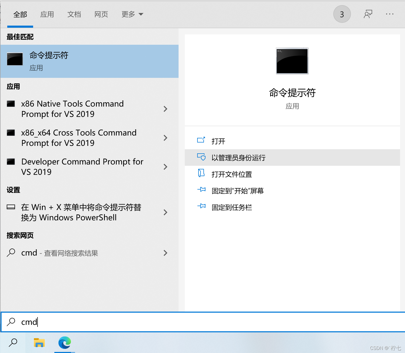 也可以使用搜索框输入cmd,点击右边的以管理员身份运行即可