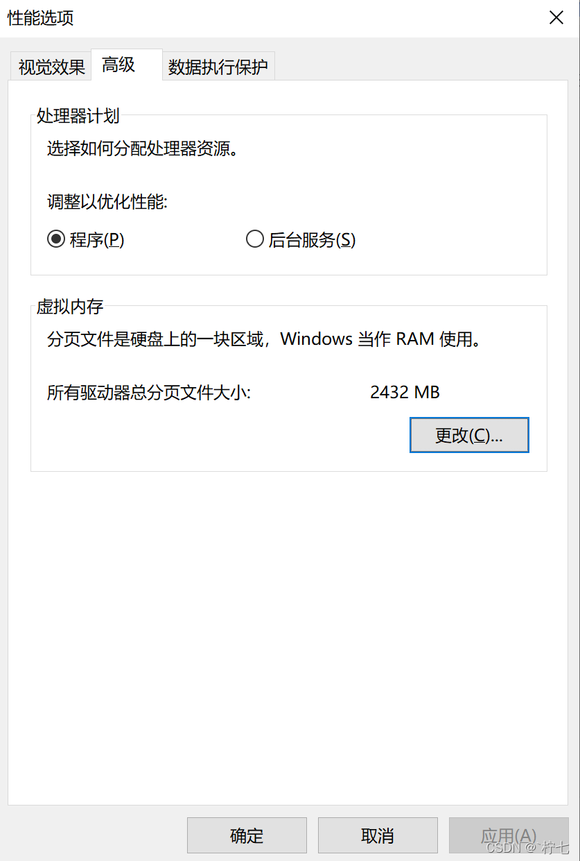 右键点击【此电脑】图标,在【属性】界面中选择【高级系统设置】进入,在【性能】窗口中点击【设置】切换至【高级】选项,界面如下图所示: