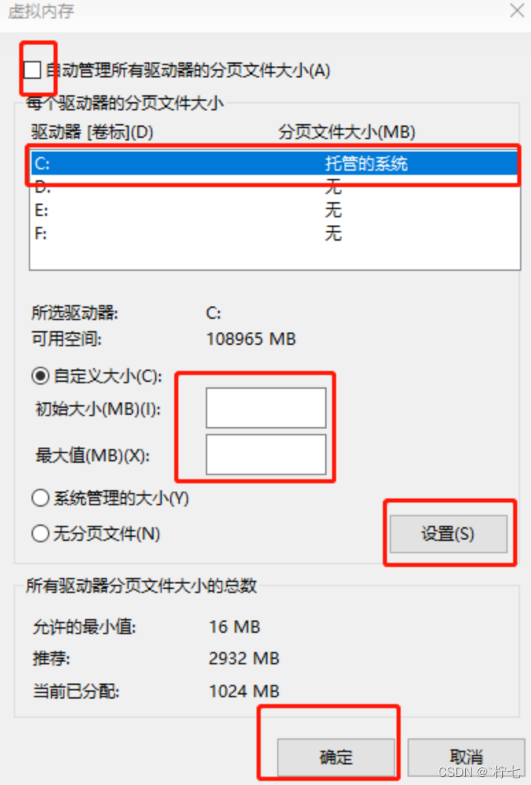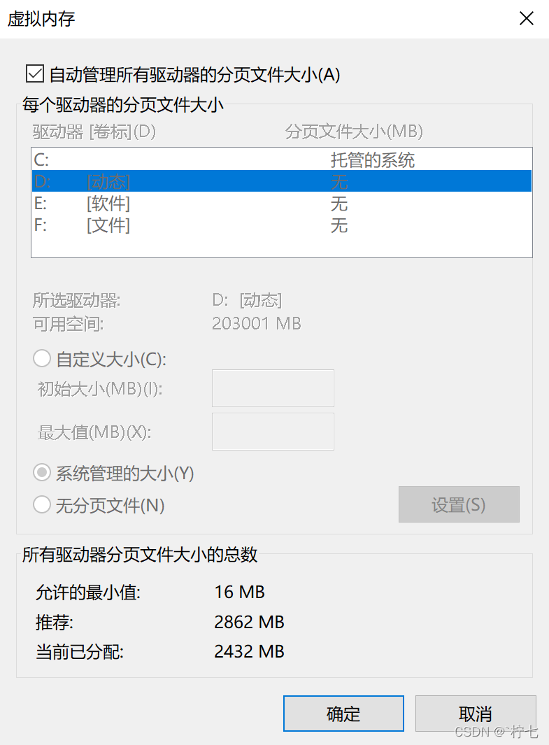 或者也可以选择在以下窗口中,取消勾选【自动管理分页文件大小】复选框,如下图所示。将空间设置好大小后点击【设置】并【确定】,最后重启电脑就可以完成虚拟内存的转移了。