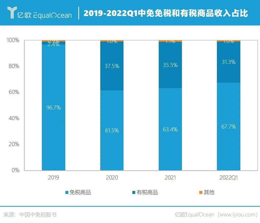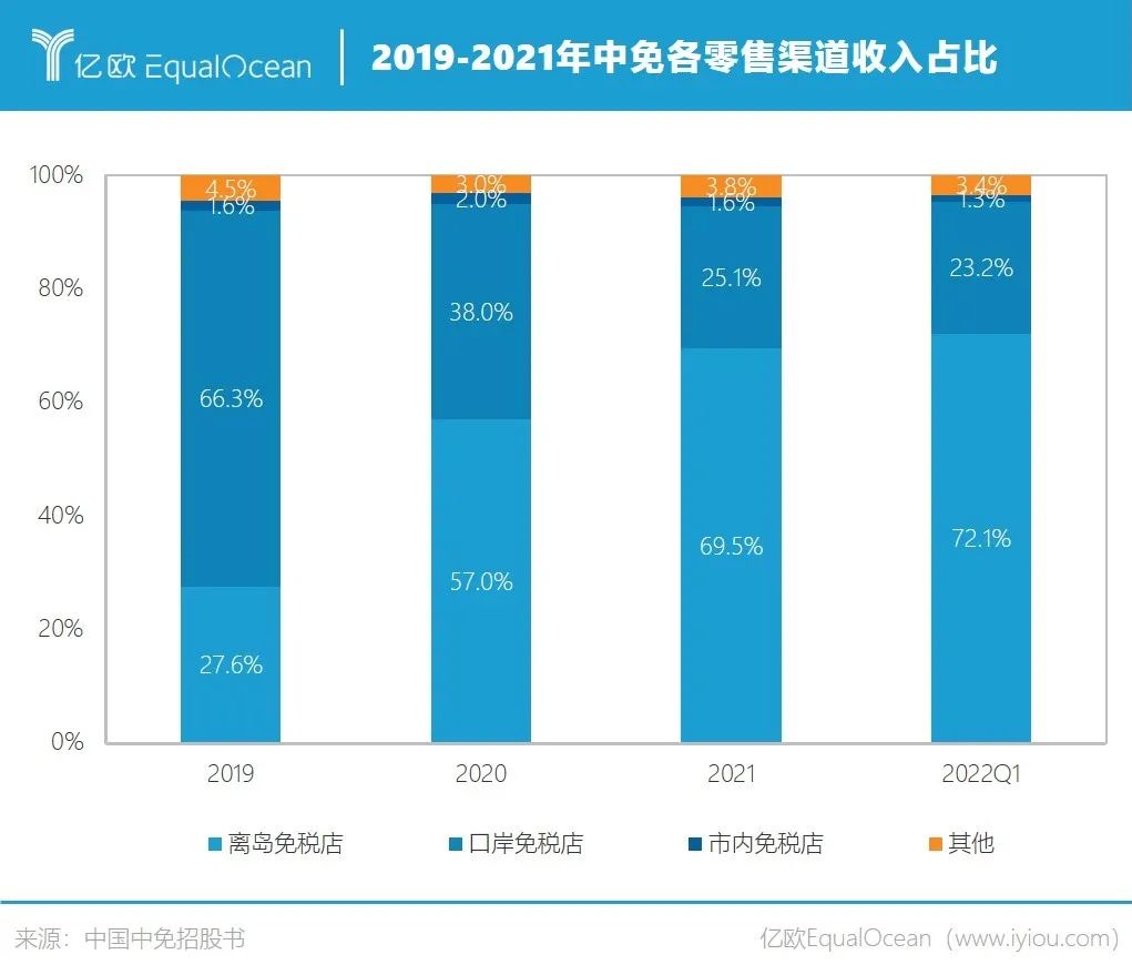相比之下,受疫情影响国内海外航线大面积关停,中免口岸免税店的收入占比由2019年的66.3%下降至2022年第一季度的23.2%。
