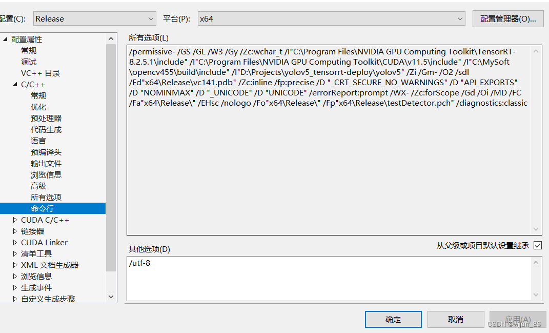 选中当前项目——右键属性——配置属性——C/C++——命令行——输入/utf-8 只有完成这一步,warning信息才会真正消失。