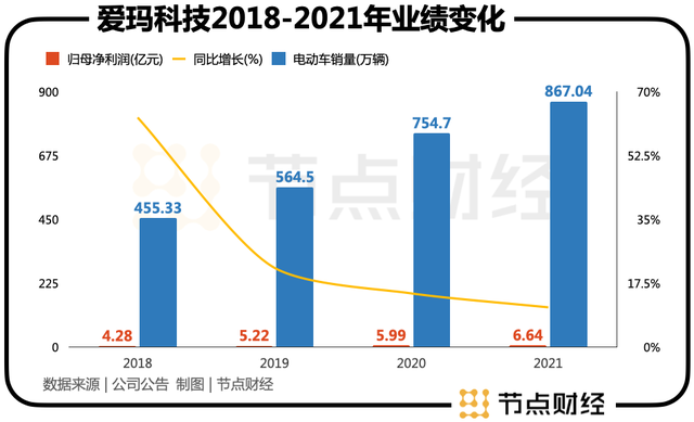 不过,最近几年,爱玛却陷入增收不增利的怪圈,2018-2021年,爱玛实现归母净利润分别为4.28亿元、5.22亿元、5.99亿元及6.64亿元;同比增长分别为62.99%、21.77%、14.76%及10.94%。归母净利润出现放缓之余,销量也在下滑。