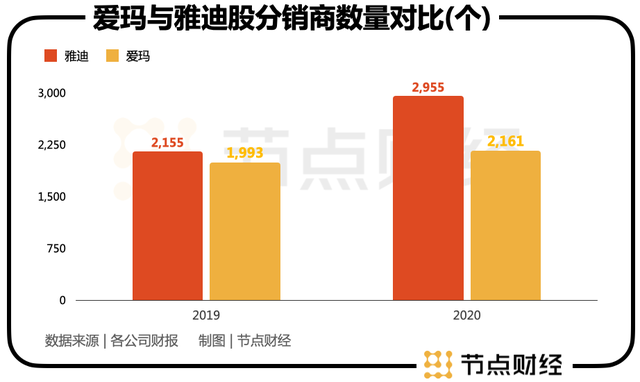 追溯过去两家的贴身肉搏,2020年是一个重要的时间。雅迪从2019年开始,默默开始加大对渠道的布局。在分销商方面,2019-2021年个数分别为2155、2955、3353个,同比增长18%、37%、13%;专卖店个数2019-2021年分别为1.2、1.7、2.8 万个,同比增长 33%、42%、65%。
