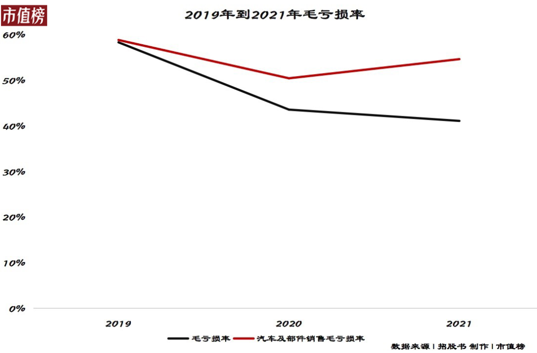2019年—2021年,威马车辆及部件销售业务的毛亏损率分别为58.8%、50.4%和54.6%,整体亏损收窄幅度小,且2021年在恶化。整体毛利率有所好转,但主要是因为卖汽车监管积分。(《亏掉174亿后,威马拉响了警报》)