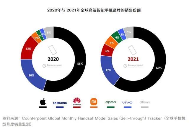 (2020-2021年全球高端智能手机销售份额图 图源:Counterpoint 官网)