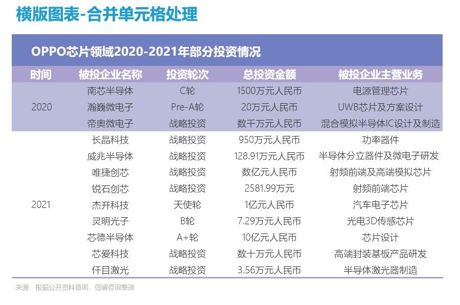 而OPPO在2021年才开始加速投资,目前OPPO已经投了14家半导体相关公司,除了两家自己设立的公司,其他投资情况如下: