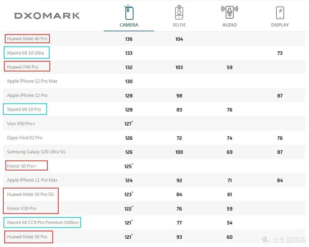 (小米、华为DXOMARK榜单排行情况 图源:什么值得买官网)