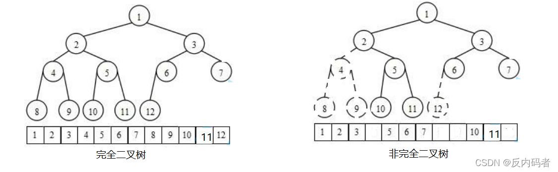 由图可见,对于非完全二叉树而言,浪费了很多空间。所以堆的表示用的是完全二叉树的表示方法