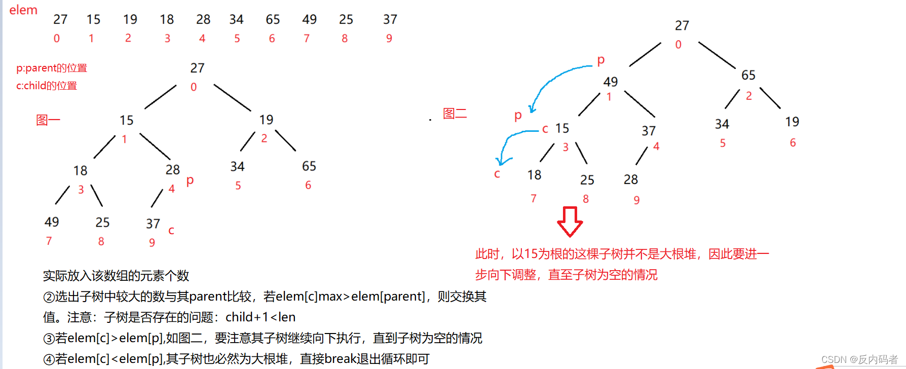 要点:左右子树必须已经是一个堆,才能调整。以大堆举例,最后调整成一棵大根堆的形式