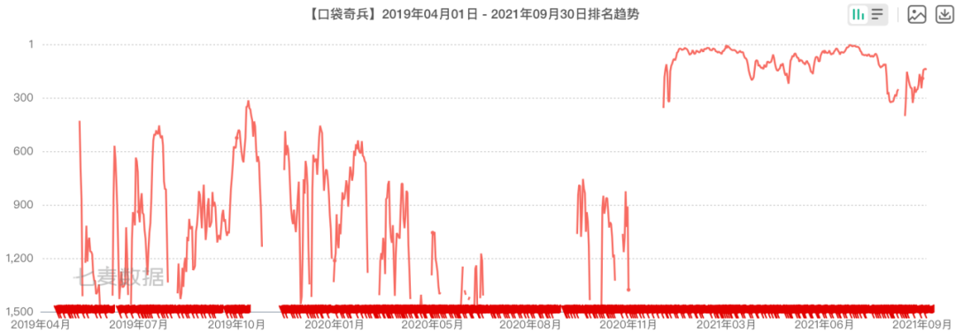七麦数据显示,《口袋奇兵》在2021年之前,一直游离在iOS免费榜300名开外的位置。而从2021年1月份开始在iOS免费榜中迎来飙升。