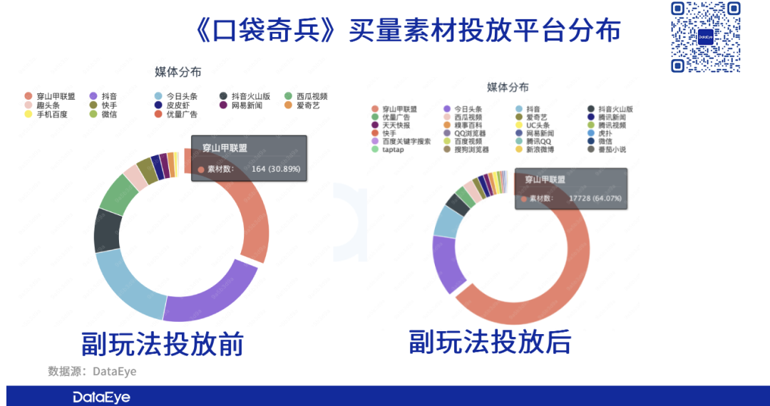 此外,从媒体投放平台分布来看,在副玩法投放前,《口袋奇兵》在穿山甲联盟中投放占比为30.89%,在副玩法投放后,穿山甲联盟投放占比就达到64.07%。换句话说,在休闲小游戏上线后,《口袋奇兵》更加注重字节系渠道的投放,特别是下沉市场、“零散”渠道的渗透。
