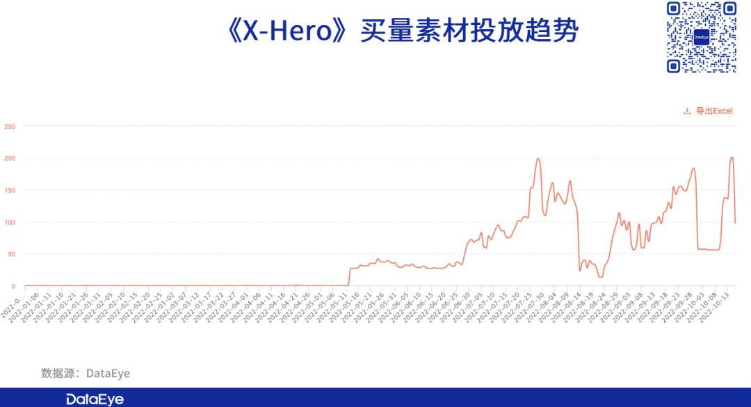 从投放量来看,《X-Hero》从2021年11月到今年5月份并没有在买量领域投放任何素材,而从5月份开始,便逐步增加了买量投放, 并在7月份、9月份迎来巅峰期。而根据DataEye监测的数据来看,《X-Hero》在买量领域的素材投放可以分为两部分来看。