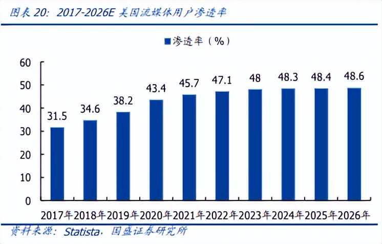随着疫情逐步得到控制,2022年以来,全球流媒体市场的红利与日俱减。Statista数据显示,美国流媒体的用户渗透率从 2017 年 的31.5%扶摇直上,提升至 2020 年的 43.45%,但是在 2020 年之后明显增速放缓,预计2026年也不过48.6%。