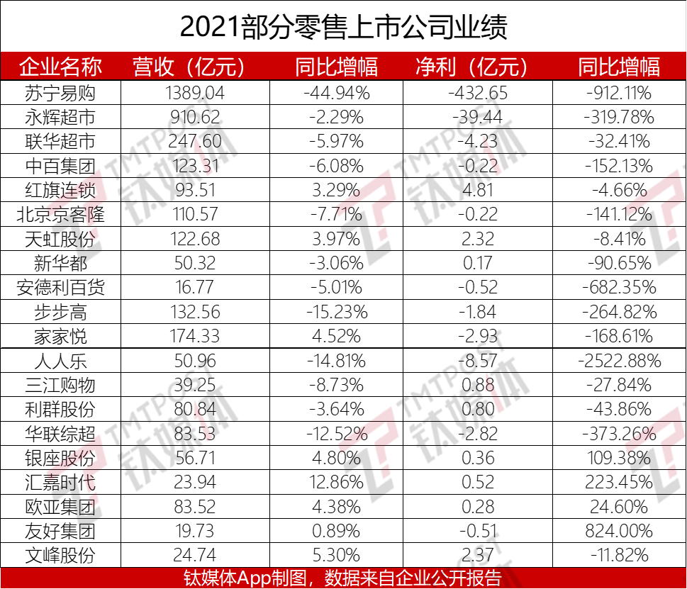 净利润方面,16家企业出现同比下滑,包括人人乐、永辉超市、华联综超等在内甚至成倍下滑,最大降幅更是高达20倍;11家企业出现亏损,其中苏宁易购巨亏432.65亿元,成为2021年度亏损王。