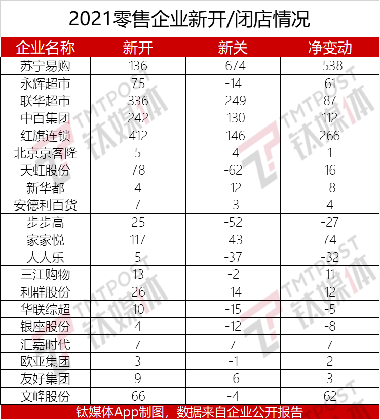 据钛媒体App统计,20家商超上市企业2021年共关闭门店1480家。其中,苏宁易购以674家居首,聚焦家电3C核心业务,其全部关闭了红孩子母婴店面;联华超市以249家次之,包括直营门店54家、加盟店195家;红旗连锁以146家位列第三。