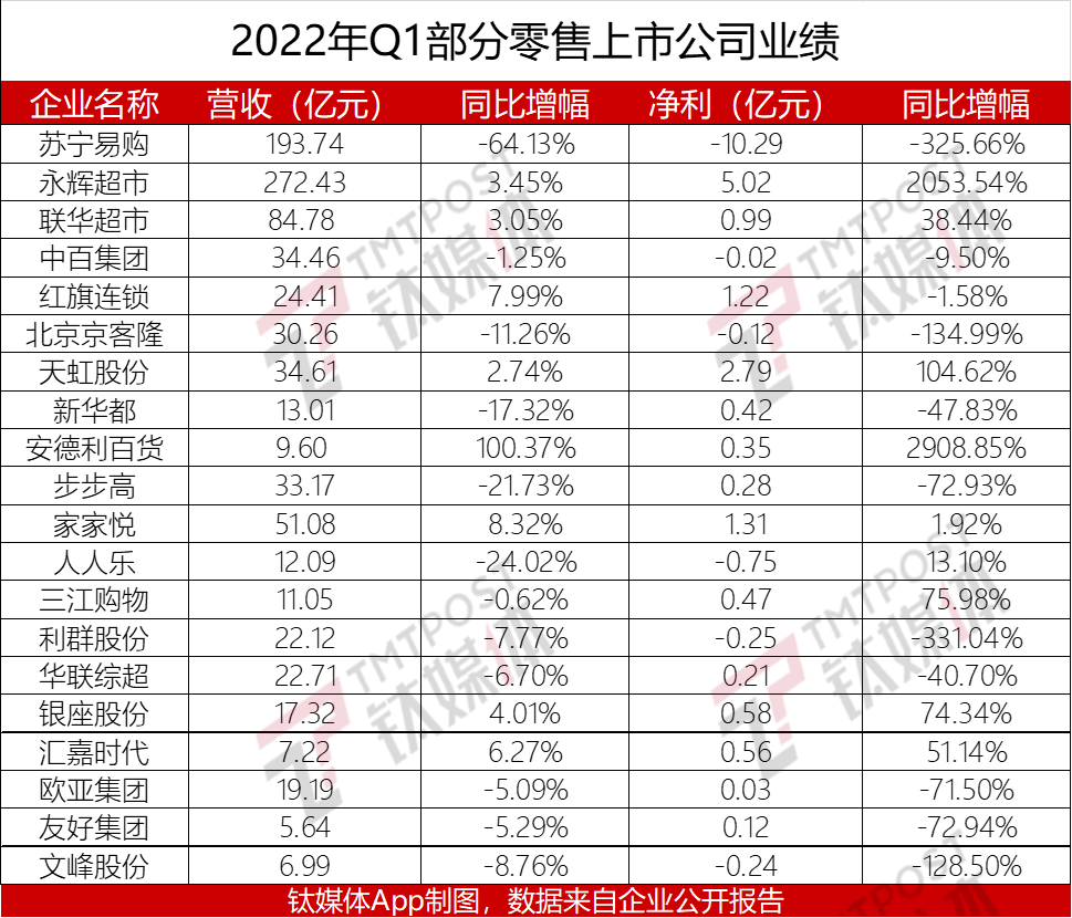 不过,进入2022年,商超零售行业罕见地出现了回暖迹象。第一季度,包括永辉超市、联华超市、安德利百货等在内不仅营收实现同比增长,净利润也转正了,其中,永辉同比大增超20倍,安德利百货同比增幅近30倍。
