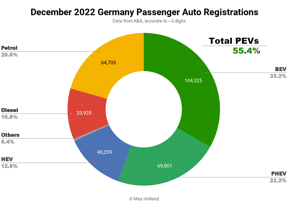 此外,作为欧洲最大的汽车市场,拥有BBA的德国燃油车市场也在快速下跌。根据数据显示,12 月,插电式汽车占德国当月乘用车销量的 55.4%,纯电动汽车占三分之一 (33.2%),插电式混合动力汽车占五分之一 (22.2%)。无插电式混合动力车占 12.8%,而纯内燃机汽车的销量首次低于三分之一 (31.8%)。