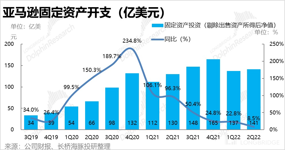 此外,公司本季固定资产投入为 141 亿,同比增速由先前 20% 以上,大幅下降到本季的 8.5%。可见亚马逊总数开始放缓于营收增速错配,且严重拖累公司利润的资本投入节奏了。