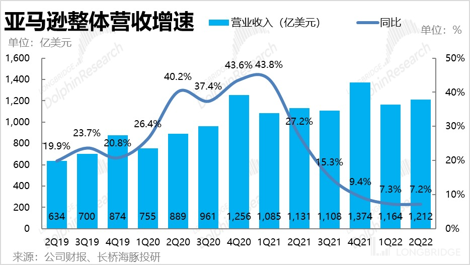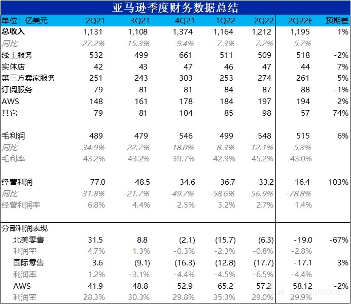 首先从整体来看,亚马逊 2Q22 总营收 1212 亿美元,同比增长 7.2%,增速与上季度相当,并未如预期中继续放缓。此外本季实际营收也超过了公司指引上限的 1210 亿和市场预期中值的 1195 亿。