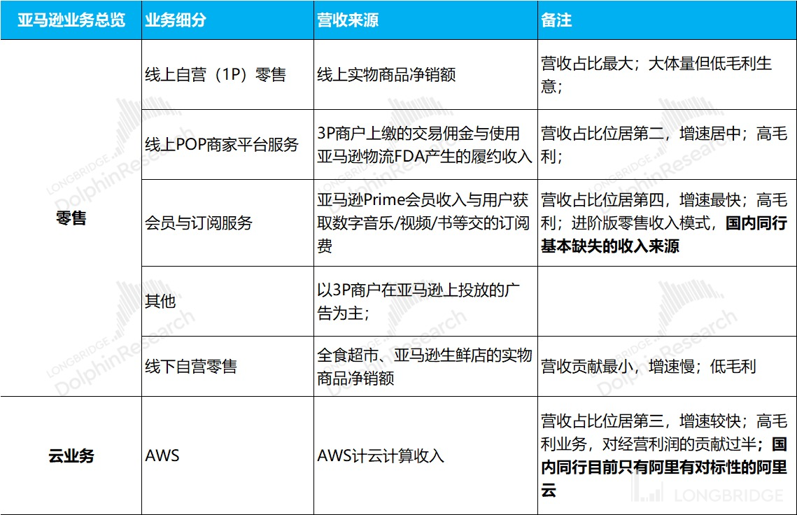 从收入结构来看,亚马逊的业务主要分为零售相关业务和云服务两大类。其中零售大类可细分为线上自营、线上 3P 卖家服务(佣金与履约费)、线上广告、会员与订阅服务,及线下零售业务。