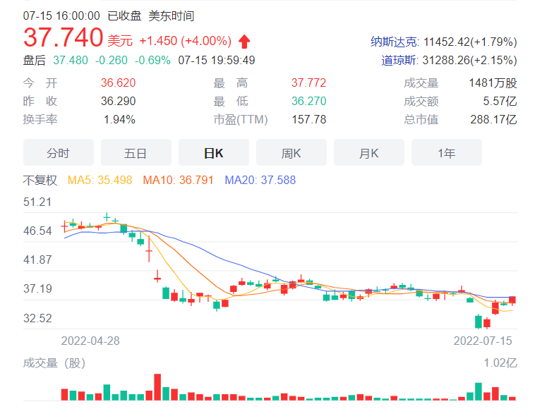 截至当地时间7月15日收盘,推特报收37.74美元,比协议收购价54.2美元低了30%。来源:百度股市通