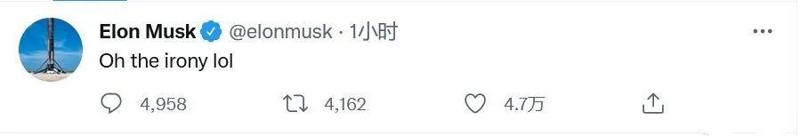 马斯克似乎“毫不在意”。他在推特上发帖称,“真讽刺,哈哈”。