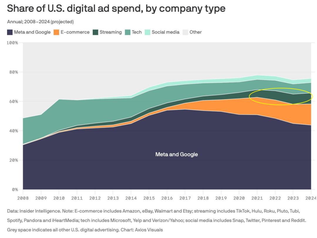 2008~2024 年美国数字广告市场各类别广告主的支出占比变化丨数据来源:Insider Intelligence