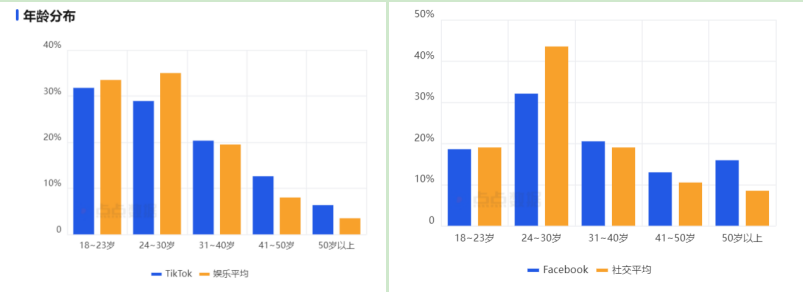 TikTok(左)和 Facebook(右)用户年龄分布丨数据来源:点点数据
