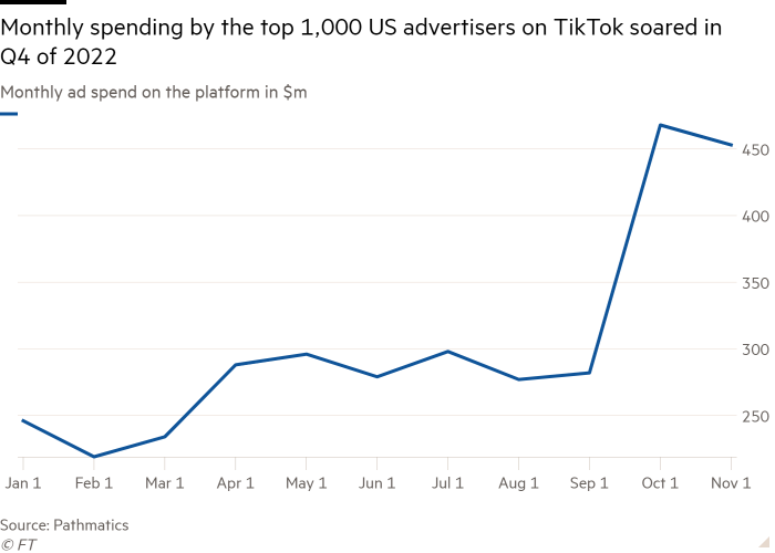 2022 年 Q4 美国 Top1000 广告主在 TikTok 上的投放开支变化丨来源:Financial Times