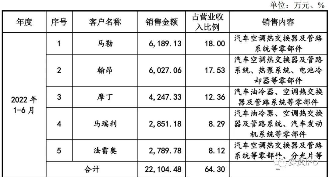 外销占比高的同时,其前五大客户也较为集中。2019年-2022年6月,前五客户占比分别是83.76%、77.71 %、65%、64.3%。不过上述报告期内,其前五大客户未发生变化。均为翰昂、马勒、摩丁、法雷奥、马瑞利这些全球一级汽车零部件供应商,