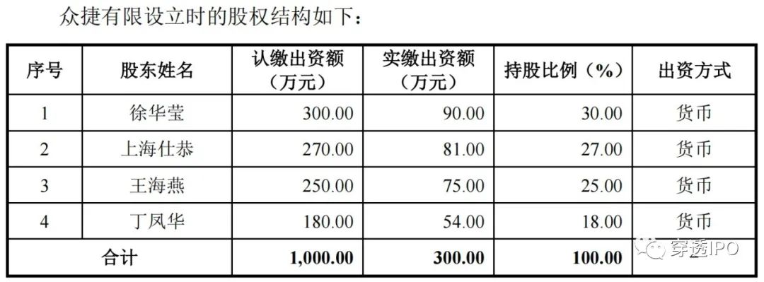 2010年众捷有限成立时,由丁凤华、徐华莹、王海燕以及上海什恭共同出资,注册资本1000万元,首期以货币出资实缴300万元。