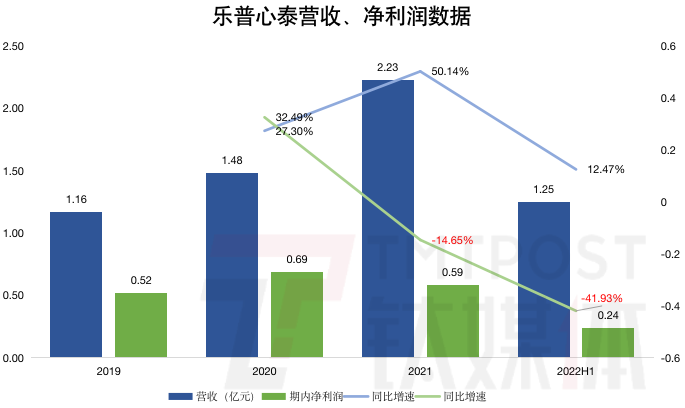 根据招股书,2019年至2021年,乐普心泰收入分别为1.16亿元、1.48亿元、2.23亿元,虽然营收规模连年上涨,但在2022年上半年,其收入增速仅12.47%,而在2021年还是50.14%。乐普心泰的增长乏力在利润端的表现更为明显,2021年及2022年上半年,其净利润同比均为负增长。