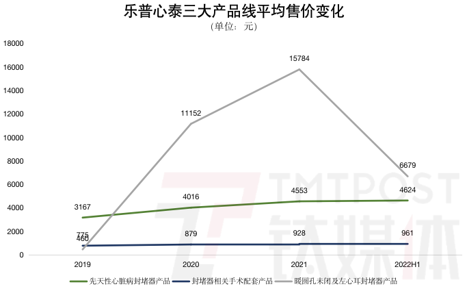 钛媒体App注意到,2019年至今,乐普心泰之所以能保持营收规模的增长,一个重要的因素是在售产品品类单价地不断攀升。一方面,乐普心泰通过乐普医疗开拓海外市场并在海外涨价,另一方面,乐普心泰价格更高的封堵器新产品不断获批推向市场,从而提升了产品线平均售价。