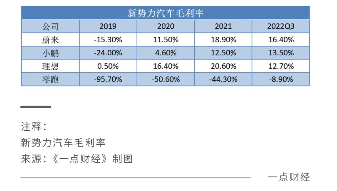近年来,特斯拉汽车销售毛利率都在25%以上,2022年达到了28.5%。而从《一点财经》的统计来看,新势力们的毛利率除了2021年理想汽车超过20%,近三年来“蔚小理”都在20%以下。