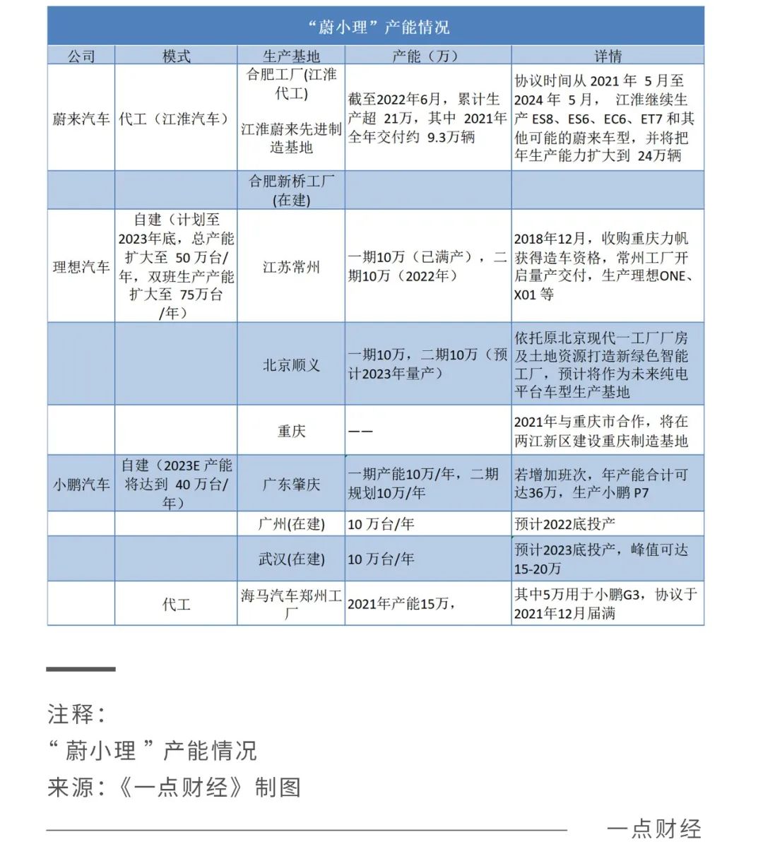 虽然耕耘多年,但产能仍然是制约新势力发展的主要因素之一。近些年,“蔚小理”通过或收购、自建,或与传统车企携手方式,试图补上产能短板,蔚来汽车就选择了江淮汽车代工,理想选择了自建工厂,小鹏则自建、代工兼有。