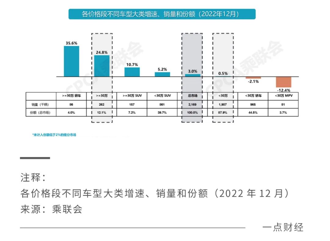 与没有抢到理想市场相比,更致命的是30万以上市场的容量本身是有限的。来自乘联会的数据显示,以2022年12月的销量来看,30万以上市场的份额为12%,月规模在26万辆,其中又以SUV为主,月规模在16万辆。