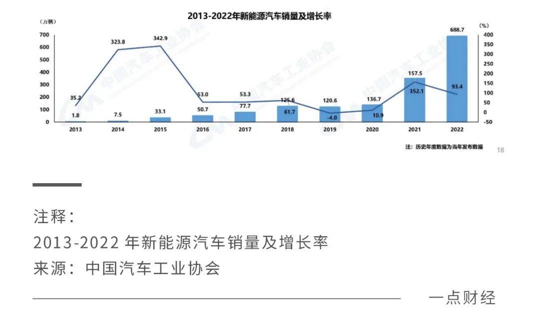 大街上来来往往的绿牌车,以及越来越无望的新能源车牌,见证着中国新能源汽车是真的热起来了。来自中国汽车工业协会的数据显示,2022年新能源汽车93.4%的增长率,是过去十年中的第四高,而第一二高的基数不到10万辆。