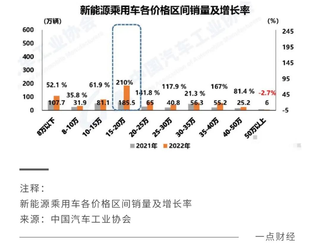 具体来看,去年一年新能源汽车的涨幅主要由15-30万价格区间贡献,中国汽车工业协会的数据显示,15-20万区间销量增长了210%,20-25万区间增长了141.8%,25-30万增长了117.9%。同时,35万-50万价格区间也表现除了不错的增长。