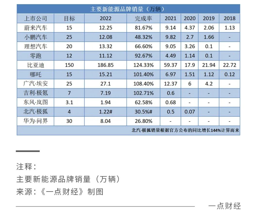 哪怕对“蔚小理”自己来说,这些销量也是不够的。定下2022年15万目标的蔚来汽车完成了81.67%;小鹏汽车25万目标销量仅完成了48.32%;理想汽车的20万目标销量则完成了66.6%。