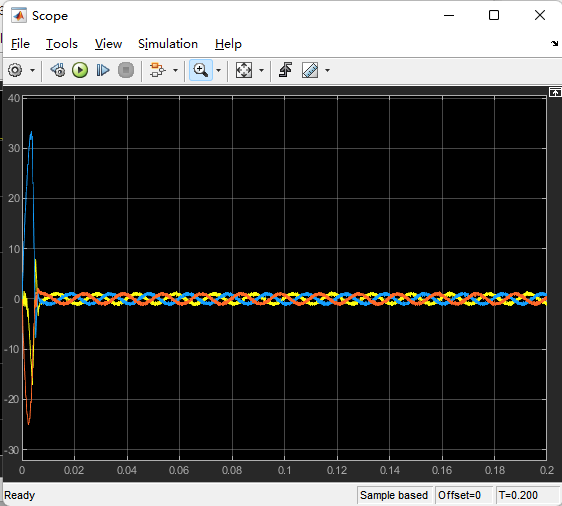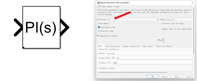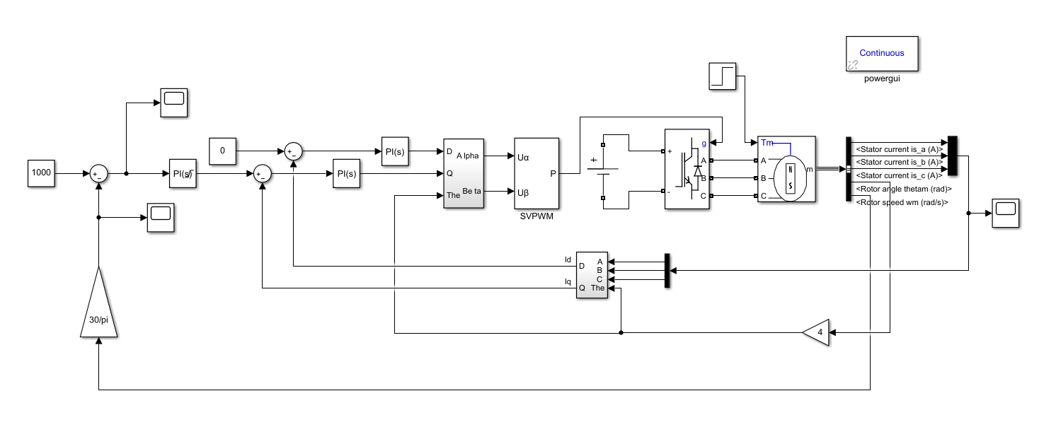 PID参数选择为:电流环两个PI控制器的比例和积分设置为10和2000,转速环设置为0.3和1,这个参数可以自己调。