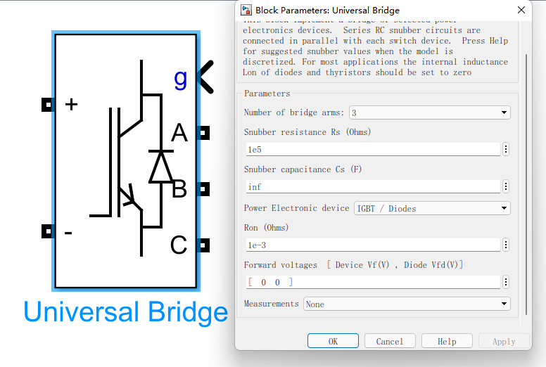 逆变器桥(Universal Bridge)和直流电源(DC Voltage Source):
