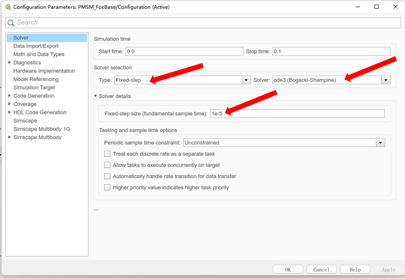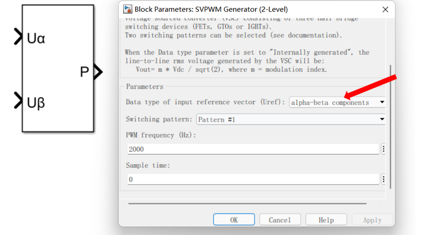 选择仿真步长,这里采样时间设置的小一点,不然后面选择自带的SVPWM会报错