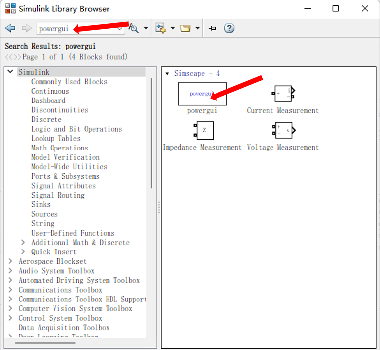 找到对应模块:(后面都是通过模型名找到对应的模型图双击或者拖到仿真界面上)