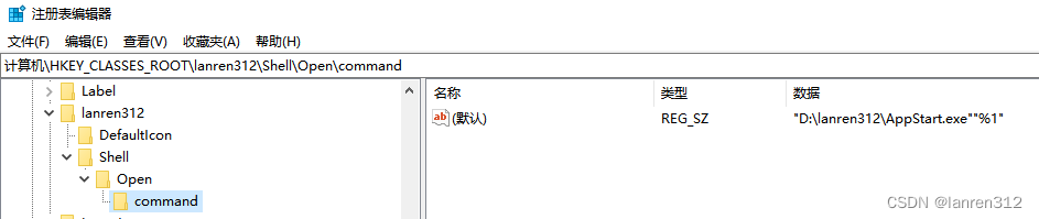 @="\"D:\\lanren312\\AppStart.exe\"\"%1\"" // 软件启动路径